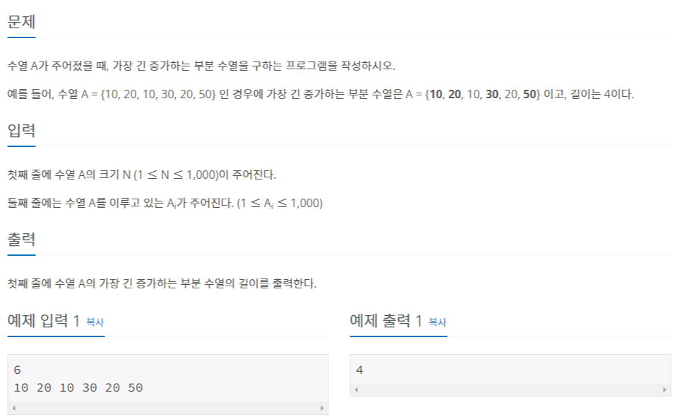 BOJ 11053: 가장 긴 증가하는 부분 수열 https://www.acmicpc.net/problem/11053 11053번: 가장 긴 증가하는 부분 수열 수열 A가 주어졌을 때, 가장 긴 증가하는 부분 수열을 구하는 프로그램을 작성하시오. 예를 들어, 수열 A = {10, 20, 10, 30, 20, 50} 인 경우에 가장 긴 증가하는 부분 수열은 A = {10, 20, 10, 30, 20, 50} 이 www.acmicpc.net 오늘의 문제다! 우선 실패한 코드부터 올려보려고 한다. n=int(input()) data=list(map(int,input().split())) streak=[1]*n pastScore=data for i in range(n): for j in range(0,i): if data[i] > pastScore[j]: st.. Computer Science/Algorithm 2022.01.02