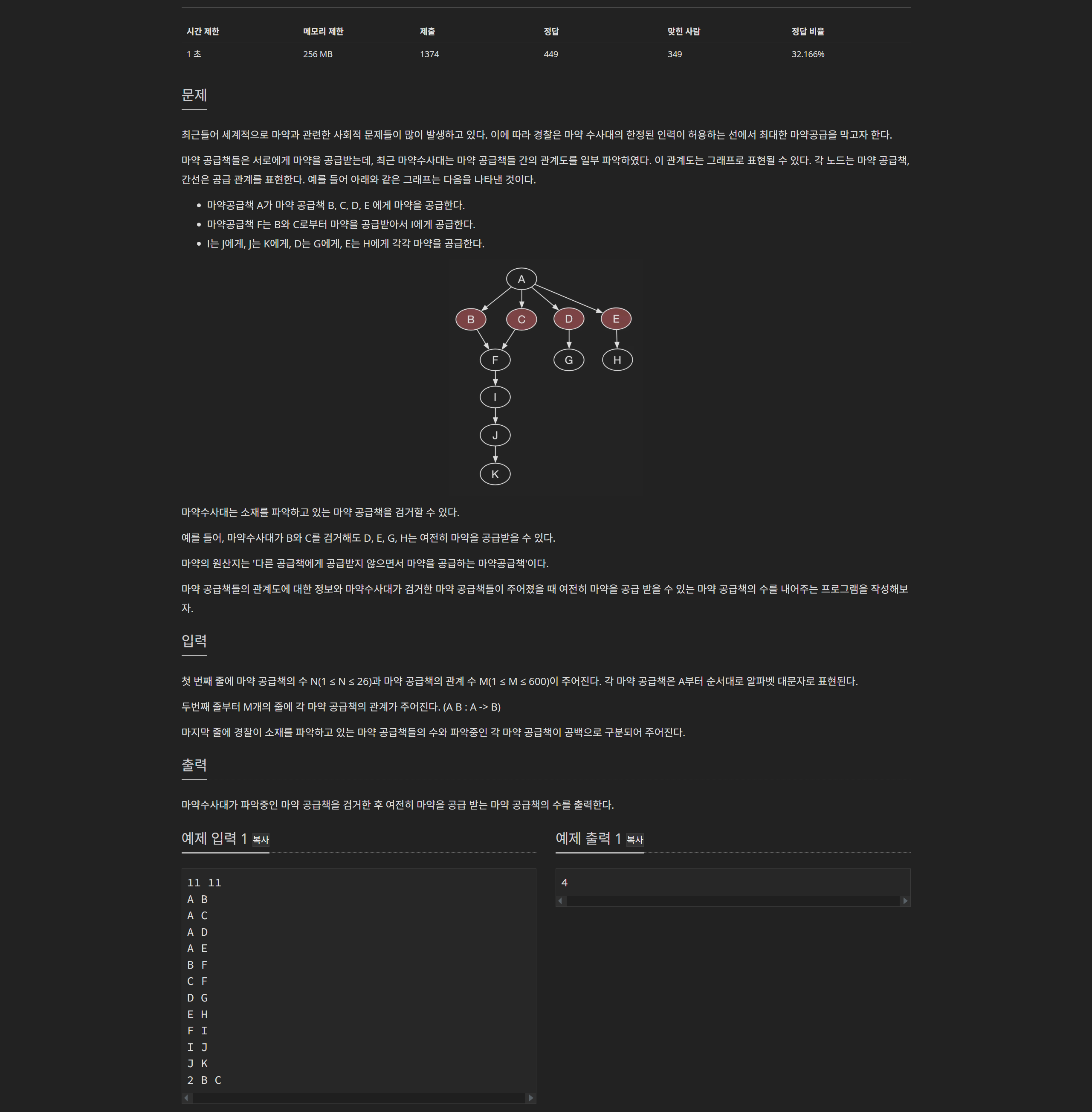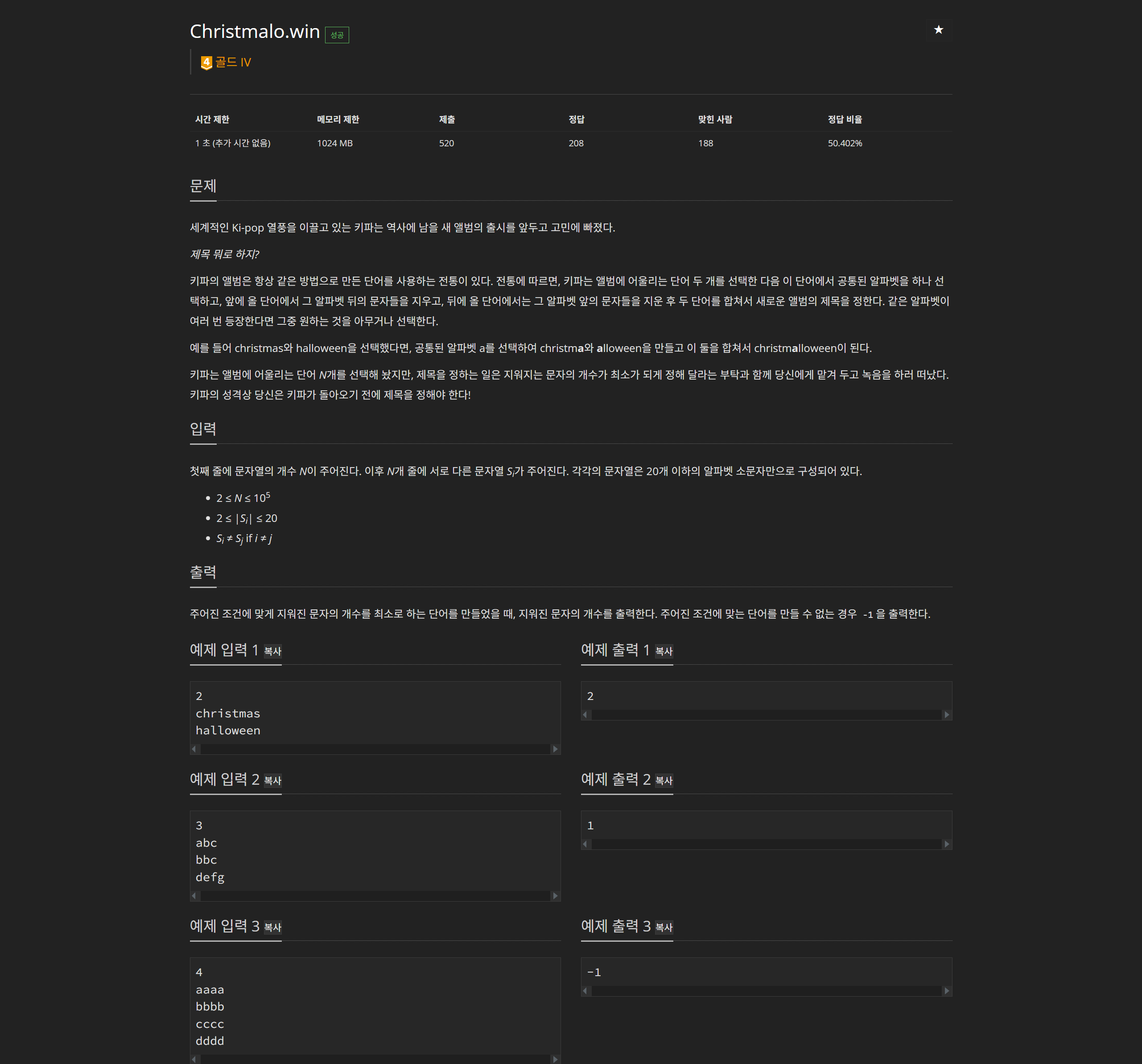 문자열들의 앞과 뒤를 잘라서, 같은 알파벳이 있으면 서로 연결시킬 수 있다.이 때, 자르는 알파벳들의 수가 최소가 되게끔 해야한다. 따라서, christma(s), (h)alloween을 통해 각각 s와 h를 지우면 연결을 할 수 있는 셈이다. 여기서 두 개의 문자열을 보고 하나하나 비교를 하게 되면, 10만개 중에 두개를 고르는, 10만 C 2 개의 연산을 해야하고, 이는 무조건적으로 TLE를 받게 된다. 문제의 포인트는 결국 '알파벳'을 기준으로 연결한다는 점이다.a부터 z까지의 알파벳이 왼쪽에서 언제 제일 빨리 나오는지, 오른쪽에서 언제 제일 빨리 나오는지를 저장한다. (left,right)각 string을 돌면서, string에서 a부터 z까지 각 알파벳이 왼쪽에서 언제 제일 빨리 나오는지, 오른..
