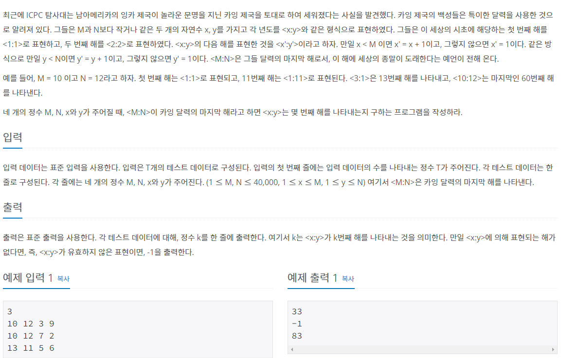 BOJ 6064: 카잉 달력 오늘의 문제! 카잉 달력이다. 문제를 보자마자, 저번에 풀었던 문제 (https://www.acmicpc.net/problem/1476)와 굉장히 비슷하다고 느꼈다. 하지만, 절대 같지 않았다. 우선 오답코드부터 보자. n=int(input()) for i in range(n): n,m,ansX,ansY=map(int,input().split()) x=1 y=1 year=1 while True: if x==ansX and y==ansY: print(year) break if x==n and y==m: print(-1) break if x==n: x=1 else: x+=1 if y==m: y=1 else: y+=1 year+=1 이렇게 단순하게 하나하나 더하면서 구하면, 시간 초과가 뜨게 된다. 아쉽다.... Computer Science/Algorithm 2022.01.07