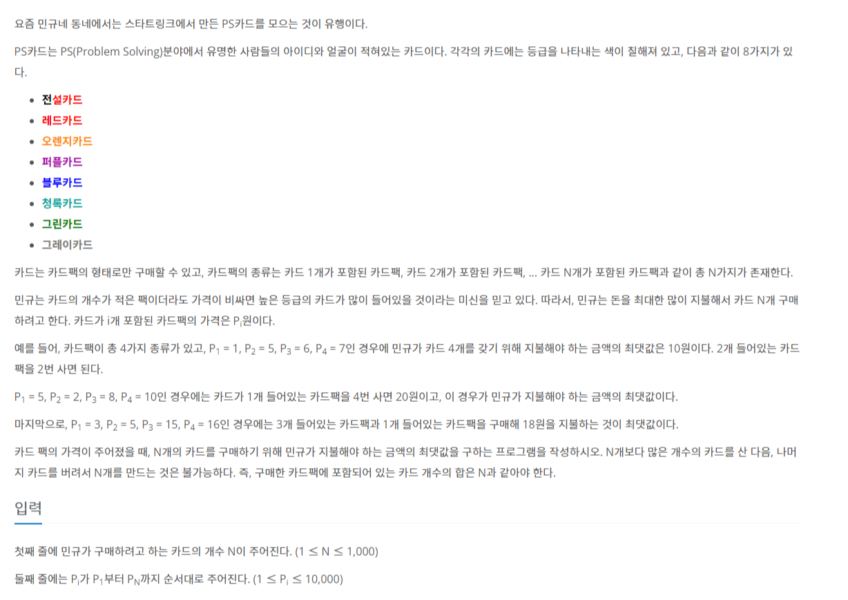 BOJ 11052: 카드 구매하기 안녕하세요! 23살 무니화니로 찾아뵙습니다! 새해 복 많이 받으시고 항상 즐코딩하십쇼! https://www.acmicpc.net/problem/11052 11052번: 카드 구매하기 첫째 줄에 민규가 구매하려고 하는 카드의 개수 N이 주어진다. (1 ≤ N ≤ 1,000) 둘째 줄에는 Pi가 P1부터 PN까지 순서대로 주어진다. (1 ≤ Pi ≤ 10,000) www.acmicpc.net 이 문제를 읽자마자, 굉장히 복잡하겠다는 생각이 들었다. 사실 근데 문제만 요란하지, 푸는 문제는 다이내믹 프로그래밍 그 자체로 풀 수 있었다. n=int(input()) cards=[0]+list(map(int,input().split())) prices=[0]*(n+1) for i in range(1,n+1): f.. Computer Science/Algorithm 2022.01.01