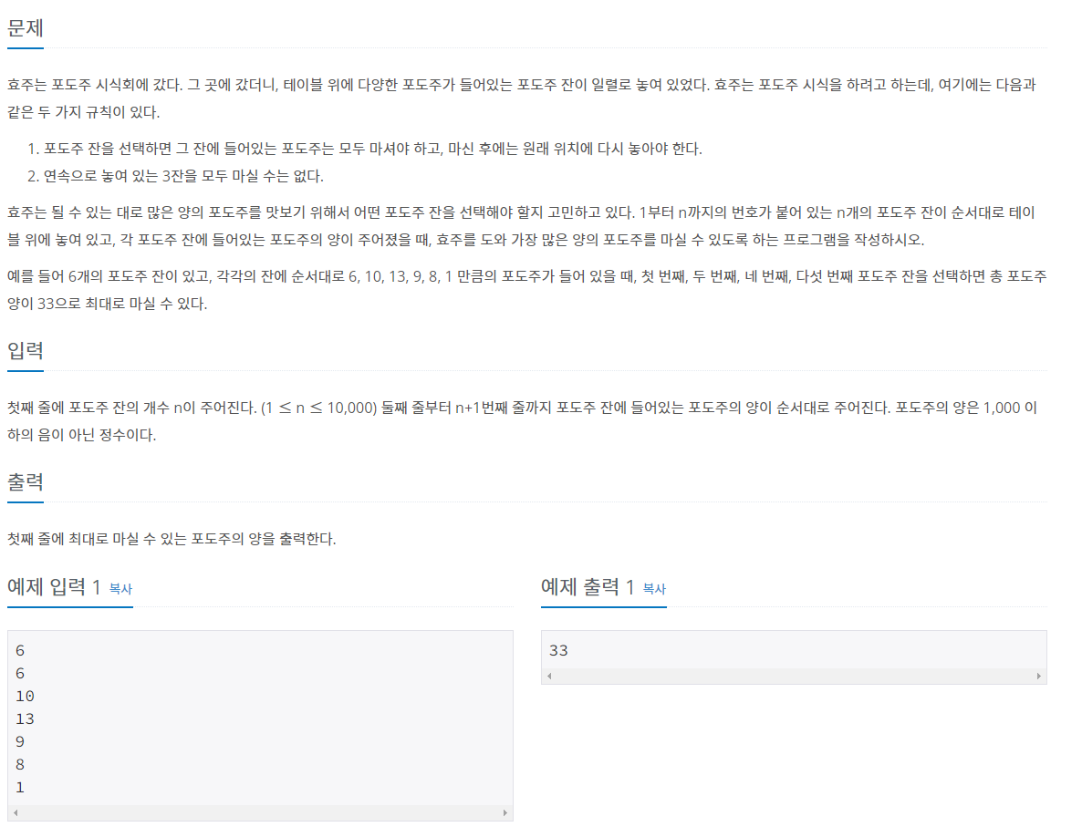 BOJ 2156: 포도주 시식 오늘도 계속되는 dynamic programming! n=int(input()) data=[] for i in range(n): data.append(int(input())) dp=[0]*n dp[0]=data[0] if n>1: dp[1]=data[0]+data[1] if n>2: dp[2]=max(data[0]+data[2], data[1]+data[2], data[0]+data[1]) for i in range(3,n): dp[i]=max(dp[i-2]+data[i],dp[i-3]+data[i-1]+data[i],dp[i-1]) print(dp[n-1]) 이 문제에서는, 3번 연속으로 와인을 마시면 안된다. 그렇기에, 3개 이상의 와인이 시식 가능할 때, i-3 i-2 i-1 i i-3 i-2 i-.. Computer Science/Algorithm 2022.01.05
