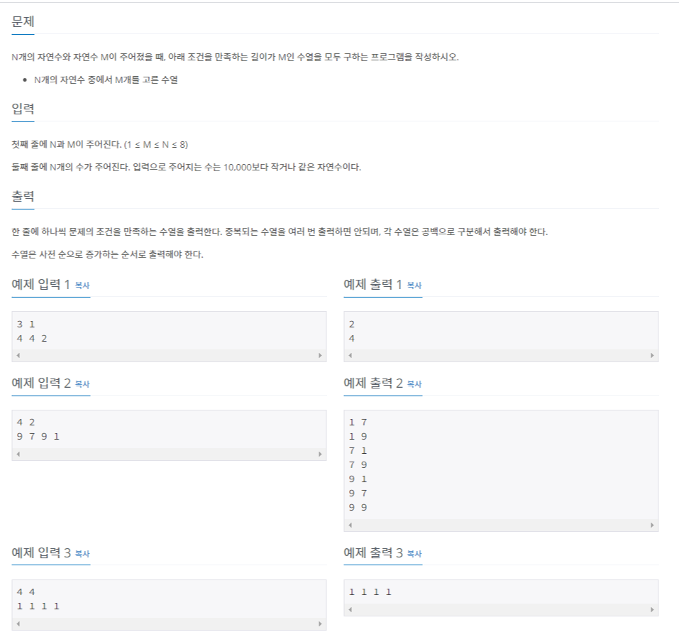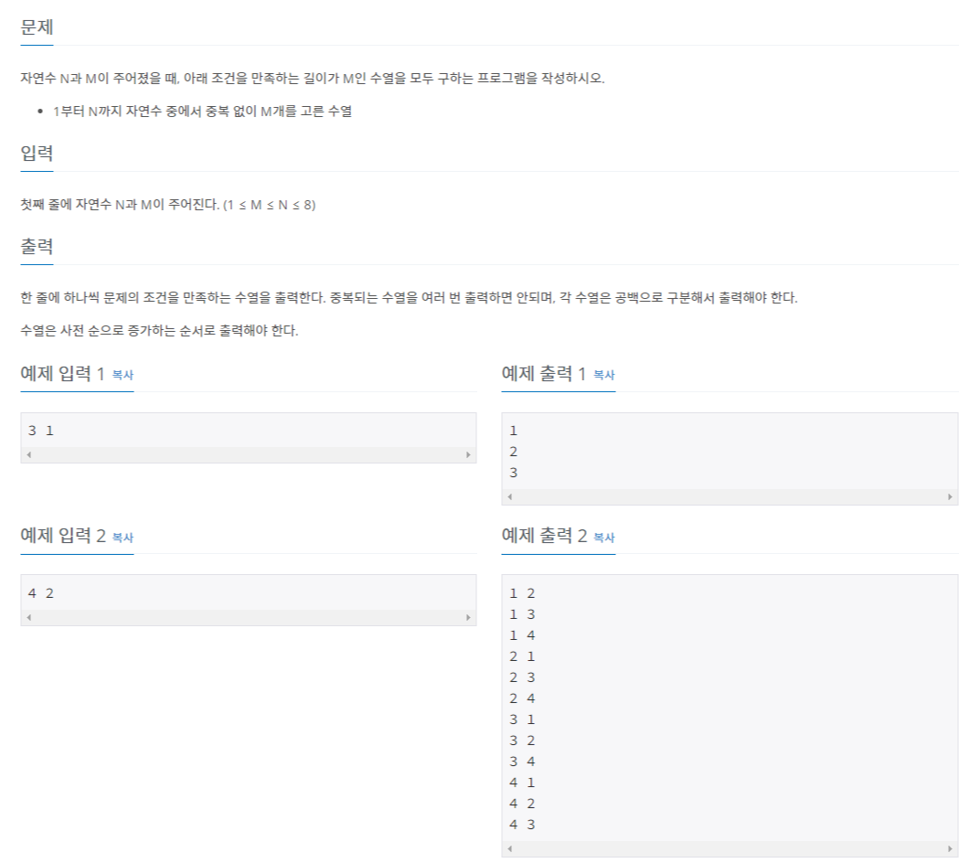 BOJ 15469: N과 M (1) 오랜만에 포스팅해봅니다! 휴가 및 격리 때문에 그동안 공부를 하지 못했네요 ㅠ 아직 백트래킹에 대한 내용을 아는 게 없었기에 각종 블로그 및 풀이들을 보고 결정했다. 물론 combination을 외부 라이브러리에서 사용할 수 있었지만, 이는 별로 교육적으로 도움이 되지 않을 것 같아서 이 방법은 사용하지 않았다. 내 풀이: 여기서 사용되는 d는 depth의 줄임말로, 몇 개의 수를 출력해야 하는 지를 담고 있다. solved라는 함수를 만들어서, 전 depth로 넘어가기 전에 result에 쓰이지 않는 수를 넣는 식으로 함수를 완성했다. Computer Science/Algorithm 2022.02.05