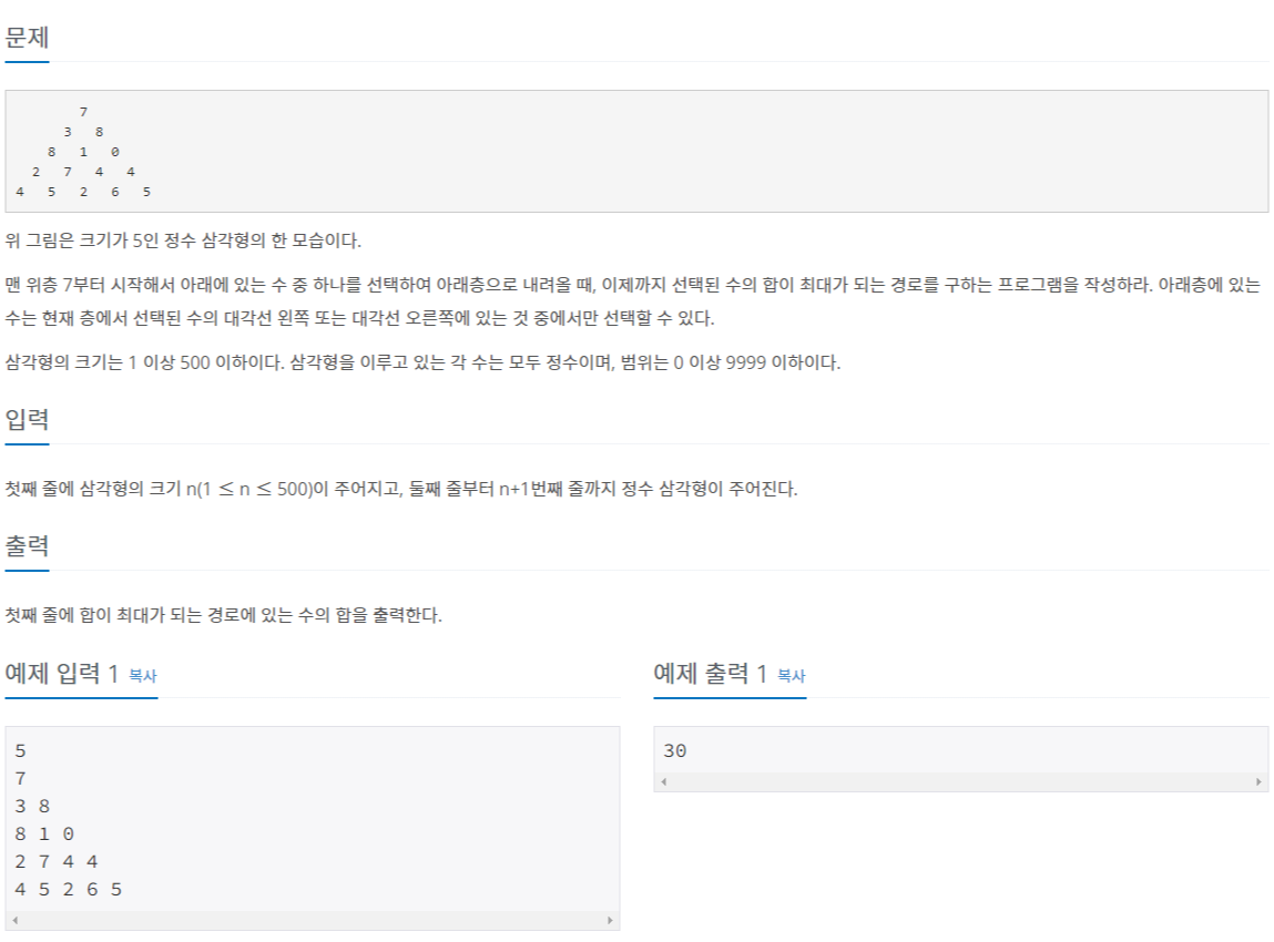 BOJ 1932: 정수 삼각형 다이내믹 프로그래밍 문제는 정말 많다....ㅠ 문제가 많은 만큼, 만들어 낼 수 있는 점화식도 정말 다양하고, 문제의 종류도 정말 많다. 그런 만큼, 더욱 열심히 문제를 풀어야겠다는 생각이 든다. n=int(input()) data=[] for i in range(n): data.append(list(map(int,input().split()))) dp=data dp[0]=data[0] for i in range(1,n): for j in range(i+1): if j==0: dp[i][0]=dp[i-1][0]+data[i][0] elif i==j: dp[i][j]=dp[i-1][j-1]+data[i][j] else: dp[i][j]=max(dp[i-1][j-1],dp[i-1][j])+data[i][j].. Computer Science/Algorithm 2022.01.06