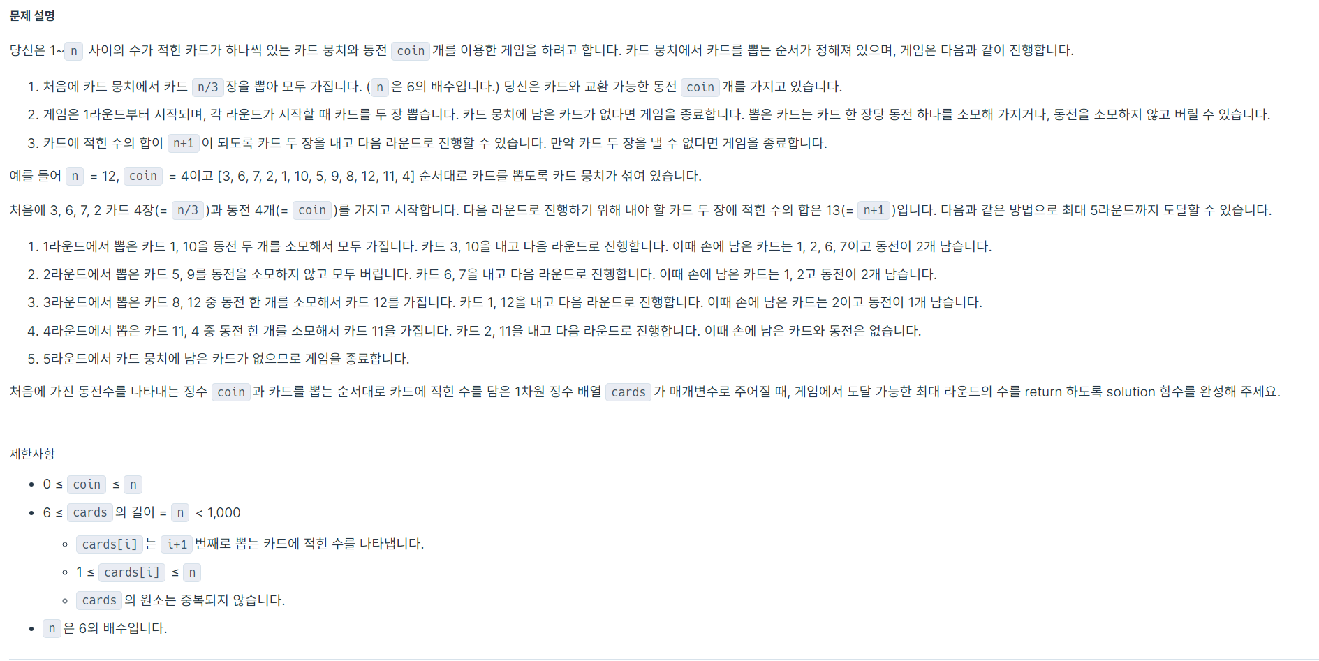 https://school.programmers.co.kr/learn/courses/30/lessons/258707?language=python3 프로그래머스 코드 중심의 개발자 채용. 스택 기반의 포지션 매칭. 프로그래머스의 개발자 맞춤형 프로필을 등록하고, 나와 기술 궁합이 잘 맞는 기업들을 매칭 받으세요. programmers.co.kr def delete_card(a,b,t): for i in a: if t-i in b: a.remove(i) b.remove(t-i) return True return False def solution(coin, cards): answer=1 n=len(cards) mycard=[cards[i] for i in range(n//3)] index=n//3 leftov..