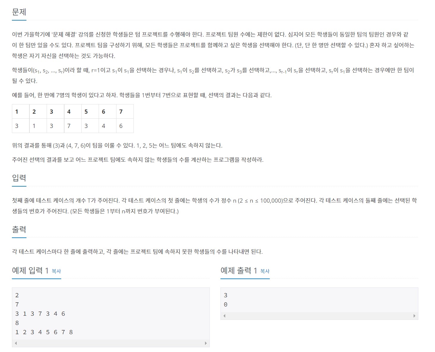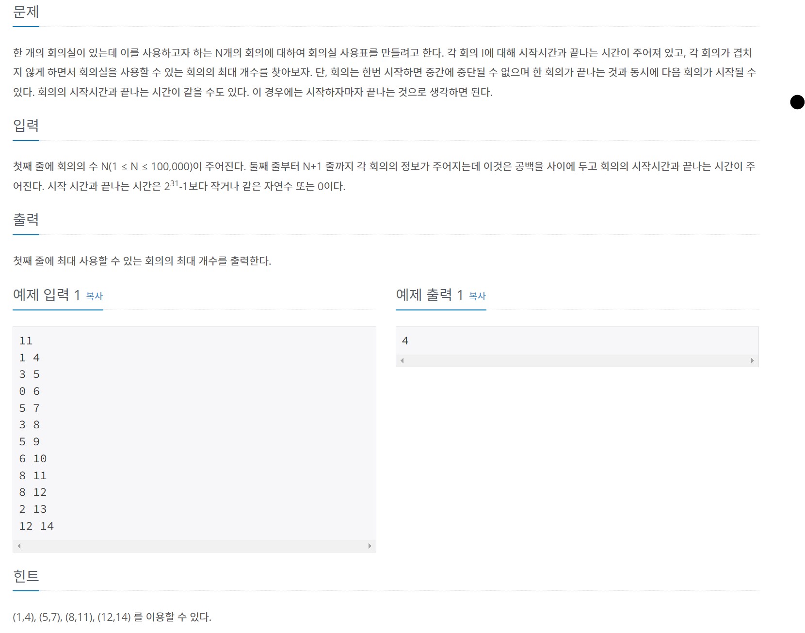 https://www.acmicpc.net/problem/1931 1931번: 회의실 배정 (1,4), (5,7), (8,11), (12,14) 를 이용할 수 있다. www.acmicpc.net 한 회의실을 사용하기 위해서 제일 많이 회의를 할 수 있는 방법을 찾는다. import sys input=sys.stdin.readline n=int(input()) data=[list(map(int,input().split())) for _ in range(n)] data.sort(key=lambda x:[x[1],x[0]]) start,end=data[0] cnt=1 for i in range(1,n): start1,end1=data[i] if end