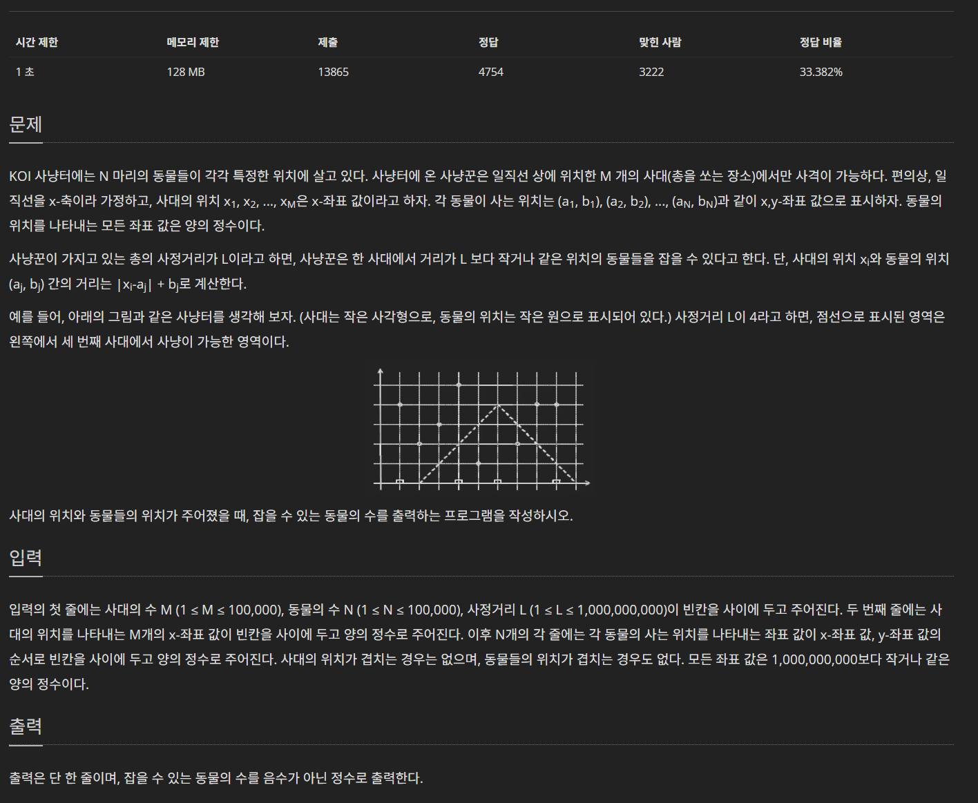 오늘 풀어볼 문제는 '사냥꾼'이라는 문제이다. 알고리즘: binary search 서브태스크 문제란 문제의 input size나 특정 조건을 부여해서, ~~~한 상황일때, AC를 받는다를 확인할 수 있다. 백준에서 '맞았습니다!' 판정을 받기 위해서는, 모든 서브태스크, 즉 케이스를 통과해야 한다. 결국, '추가적인 제약 조건은 없다'의 40점어치를 맞춰야 결국 맞았습니다! 인 것이다. 우선, 문제에서는 총을 쏠 수 있는 사대들을 준다. 사대들에서 택시 거리로 L 만큼 떨어져있는 곳까지 총을 쏠 수 있다. 사대는 (X, 0)의 위치에 있기 때문에, 동물들과 사대의 x좌표를 비교해서, 동물과 제일 가까운 x좌표를 정한다. 바로 이 때, 동물의 수가 10만까지 가능하고, 사대의 개수가 10만개까지 있을 수 ..